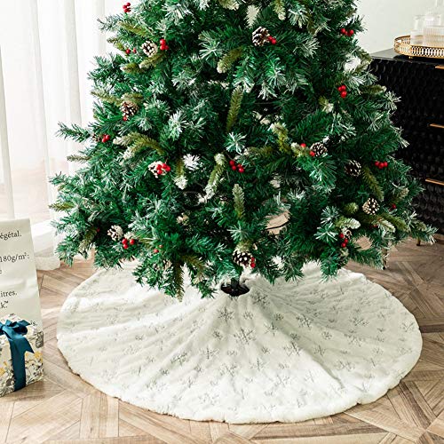 Guwheat Gonne per Alberi di Natale Gonna di Natale in Peluche di Lusso con Ornamenti in Pelliccia Sintetica Bianca per la Festa di Capodanno (Fiocco di Neve d'Argento 122 cm)