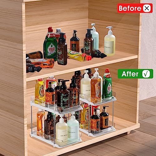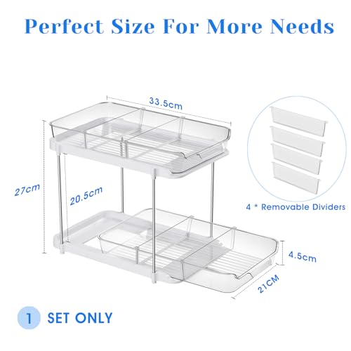 【Cassetti estraibili e divisori】 questo set per l'organizzazione dell'armadietto da cucina è dotato di 2 cassetti estraibili e 4 divisori mobili. Ogni cassetto può scorrere dentro e fuori senza problemi, rendendo un gioco da ragazzi l'accesso agli oggetti difficili da raggiungere. Il divisore mobile ti consente di regolare liberamente la spaziatura a tuo piacimento per organizzare medicinali, cosmetici, articoli di cancelleria, prodotti per la cura della pelle, profumi, spazzole, ecc.