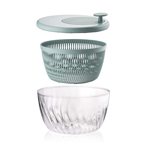 Centrifuga per insalata Spin&Store lava e asciuga l'insalata e tutte le verdure a foglia grande in modo rapido ed efficace. Dal design compatto, il suo contenitore, può diventare un'elegante insalatiera da portare in tavola. Il cestello all'interno è dotato di piedini che lo tengono sollevato dalla base del contenitore: questo particolare permette di utilizzare la centrifuga anche come contenitore per scongelare i cibi che, restando sollevati dal fondo grazie ai piedini, non rimangono bagnati. L