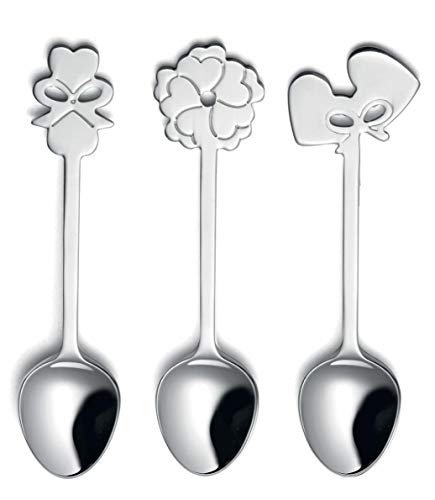 Set 6 cucchiaini in acciaio e impreziositi da un decoro sul sommo dell'impugnatura che parla il linguaggio del cuore rappresentando nodi d'amore, fiori, cuoricini con un segno grafico contemporaneo