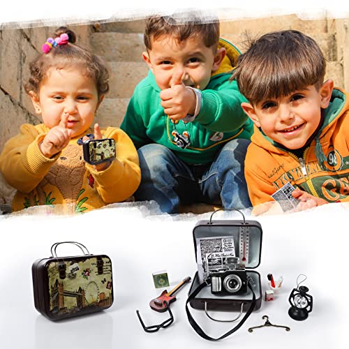 [Accessori per la casa delle bambole in miniatura]: Riceverete 1 x valigia in miniatura, 1 x dentifricio, 1 x spazzolino da denti, 1 x tazza, 1 x sapone, 1 x macchina fotografica, 1 x lampada a petrolio, 1 x chitarra, 1 x libri (colore casuale), 1 x occhiali, 1 x giornale, 1 x appendiabiti, 1 x termometro. Adatto per artigianato, mini casa fai da te, micro paesaggio, decorazione della stanza.