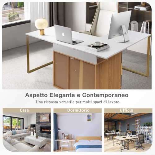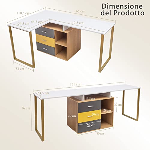 GYMAX 220cm Scrivania Doppia Postazione, Scrivania per Ufficio e Studio, con 3 Cassetti e 2 Ripiani, con Struttura Metallica, 2 Modi di Utilizzo, 220 x 55 x 76,8 cm