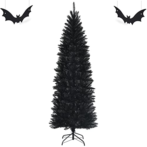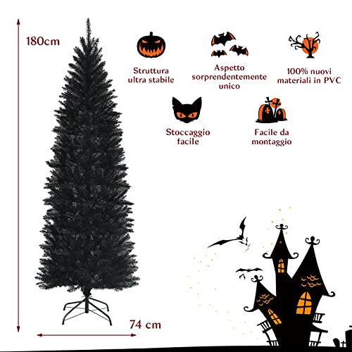 GYMAX Albero di Natale Slim Nero 210 cm, Albero Artificiale di Halloween, 995 Rami Folti in PVC Ignifugo, Base Pieghevole in Ferro, Alberi Decorativi di 3 Size