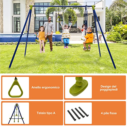 # Ideale per i bambini # Il nostro set di altalene da esterno è appositamente progettato per i bambini dai 3 ai 10 anni per giocare in cortile, giardino, parco, prato e altro ancora. È abbastanza spazioso da ospitare 4 bambini. Il sedile dell'altalena può sostenere fino a 50kg, mentre l'altalena con poggiapiedi supporta fino a 100kg.