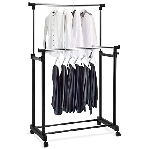 GYMAX Appendiabiti in Acciaio con Portascarpe, Porta Abiti con 2 Aste, Stand Appendiabiti con Ruote, Stand Appendiabiti Regolabile, Altezza Regolabile (Stile 2)