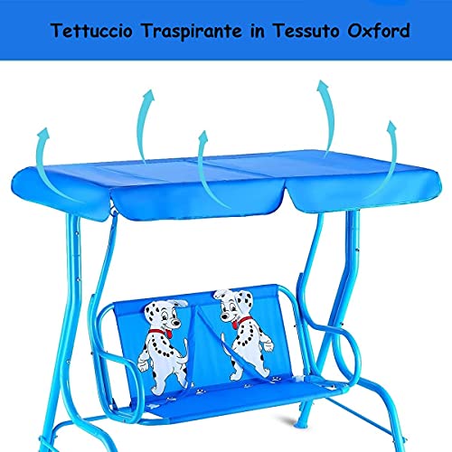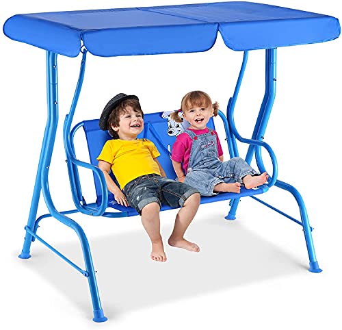 GYMAX Dondolo per Bambini da Esterno in Acciaio, Dondolo per Bambini a 2 Posti con Tettuccio e Cintura di Sicurezza, Ideale per Cortile, Nido e Giardino, Portata 80 kg (Blu)