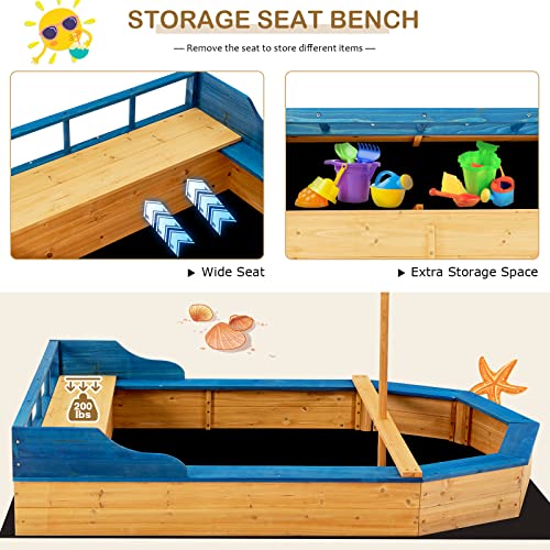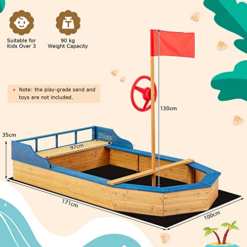 GYMAX Sabbiere per Bambini, Recinto di Sabbia di Legno, a Forma di Nave dei Pirati, con Telo Nero, Sedile e Panca, Design senza Fondo