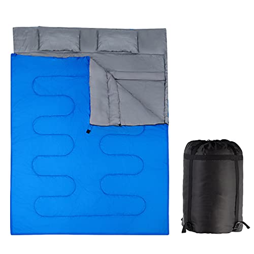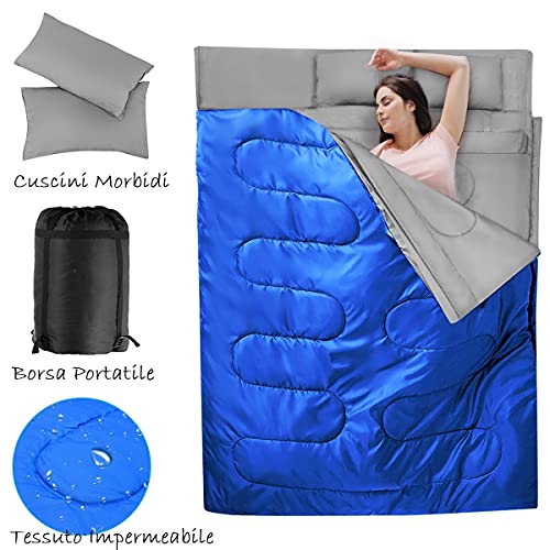 GYMAX Sacco a Pelo Matrimoniale, Sacco a Pelo Trasformabile in 2 Sacchi a Pelo Singoli con Cuscini, Ideale per Campeggio, Trekking e Escursioni, Temperatura Applicabile 0°C - 15°C (Blu)