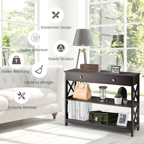 GYMAX Tavolo Consolle da Ingresso con 2 Ripiani, Cassetto, Lati a Forma di X per Corridoio, Camera da Letto, Soggiorno, Tavolo Semplice, 100 x 30 x 80 cm (Marrone)