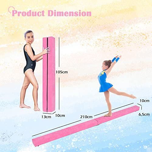 GYMAX Trave da Ginnastica in Legno di Pino e EPE con Manico, Cuscinetti Antiscivolo, Trave di Equilibrio da Pavimento Pieghevole, Ideale per Esercizi a Casa o in Palestra, 210 x 10 x 6,5 cm (Rosa)