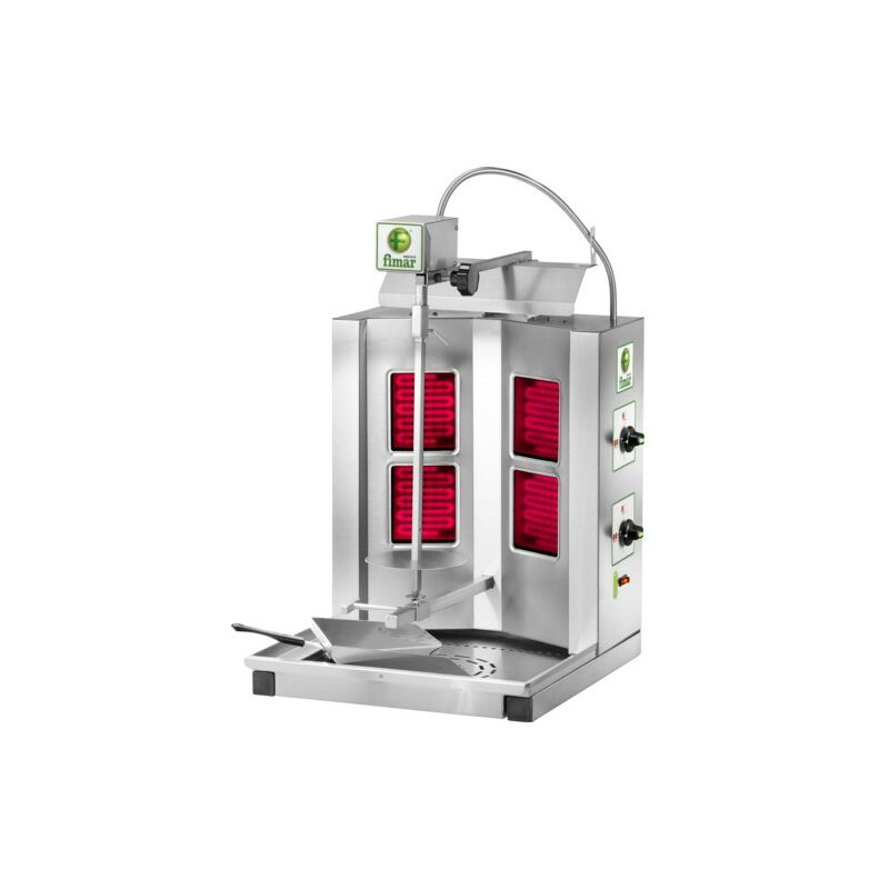 Codice RS3556 - Gyros kebab elettrico modello FI-GYR40, 230 volt, 2.8 kw, dimensioni cm. 51x53x75 (lxpxh), 4 resistenze, 3 livelli di potenza, misure massime carne 5/10 kg, diametro massimo carne cm. 47, altezza utile cottura cm. 28/32. Macchina per cuocere carne per Kebab con struttura, asta spiedo e paletta raccogli carne in acciaio inox. Resistenze ad infrarossi rivestite in ceramica, convetro di protezione resistente alle alte temperature che ne facilita la pulizia e abbassa i consumi. Regolazione resistenze a settori. Regolazione distanza asta spiedo dalle resistenze. Cassetto di raccolta residui di cottura in acciaio inox. Accessori disponibili (quotazione a richiesta): kit vetri frontali di protezione, cappa con filtro a carboni attivi 230V/1N/50Hz, 24W.