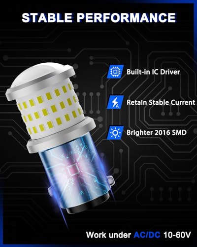 Chip IC intelligente e ampia compatibilità di tensione: Con un chip IC intelligente integrato, queste lampadine p21/5w possono regolare la corrente in ingresso, consentendo loro di funzionare senza problemi sia su tensione continua che alternata compresa tra 10V e 60V. Goditi prestazioni affidabili su diversi veicoli