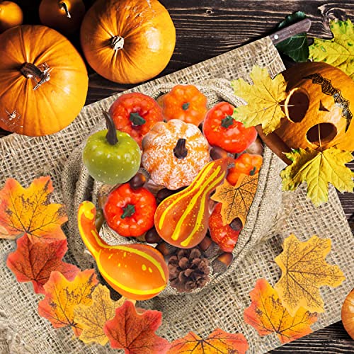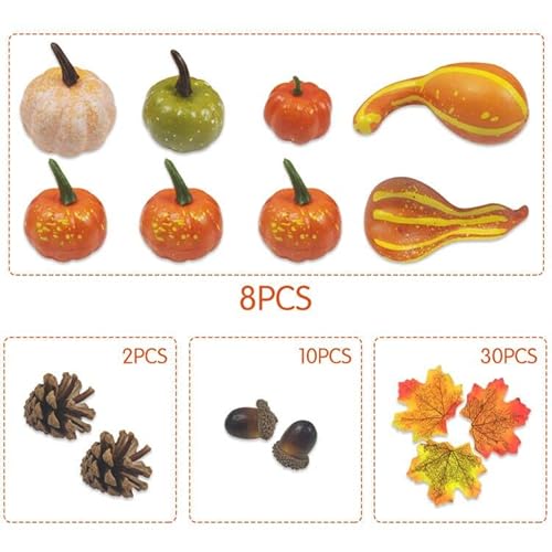 Confezione include:Il set include 6 finte mini zucche (diversi stili), 2 finte zucche, 30 finte foglie d'acero, 10 ghiande, 2 pigne, 50 pezzi in totale.Può soddisfare le tue diverse esigenze per decorare la festa del Ringraziamento, Halloween e Autunno.