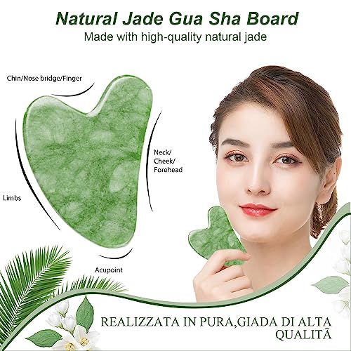 Alta qualità: il nostro set Gua Sha 100% giada naturale contiene 30 oligoelementi, come selenio, zinco, nichel, cobalto, manganese, magnesio e altri, un modo completamente sicuro e naturale per mantenere la pelle giovane. Ti dà una sensazione fresca e liscia, affina i pori, una pelle completamente idratata con un siero adeguato favorisce la circolazione sanguigna, favorisce la rigenerazione della pelle e rafforza la pelle.
