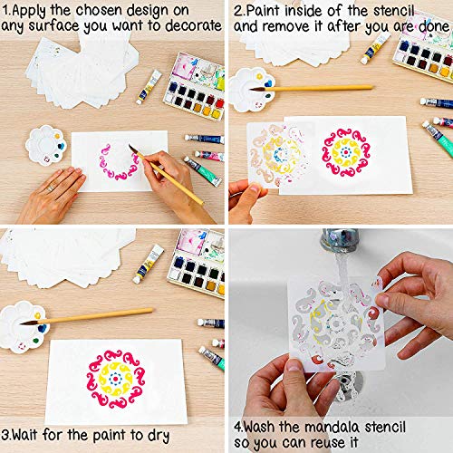 Il miglior regalo: il set di stencil Mandala è un bel regalo per bambini, amici, familiari e per se stessi. È possibile scegliere questi modelli per soddisfare le esigenze quotidiane, ad esempio la decorazione della casa, il rinnovamento dei mobili, gli album fotografici, il fai da te, il modello da disegno. E per disegnare in modo semplice, gli stencil sono adatti per la maggior parte delle penne come pennarelli a punta fine, penne a sfera, penne a sfera, acquerelli, matite colorate, matite ecc.
