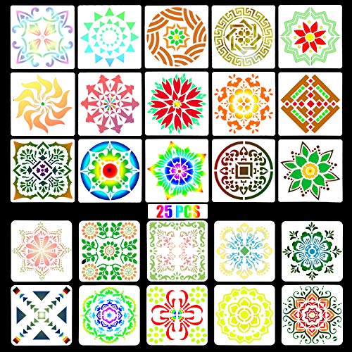 GZLCEU Set di 25 stencil con mandala, riutilizzabili, per dipingere su legno, pietra, tessuti, mobili, parete, artigianato, piastrelle per pavimento, libro degli ospiti (11 x 11 cm/15 x 15 cm)