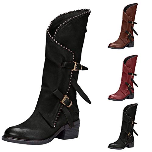 S&H-NEEDRA Stivali Alti Donna Vintage Comode Tacco Basso Largo Stivaletti Biker Fibbia della Cintura Scarpe Invernali Stile Britannico