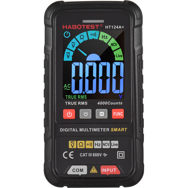 Questo strumento è un multimetro digitale intelligente a vero valore efficace, adatto per la manutenzione degli elettrodomestici, il rilevamento dei circuiti e l'insegnamento. Caratteristiche: 1. Multimetro digitale: il multimetro digitale supporta test di tensione AC e DC, test di resistenza, test di continuità, test di frequenza, mantenimento dei dati, spegnimento automatico, NVC, True RMS, campo di misurazione automatico, rilevamento del filo in tensione, diodo (solo HT124B+), capacità (solo HT124B+). 2. Schermo a colori LCD da 2,5 pollici: lo schermo a colori LCD da 2,5 pollici migliora notevolmente l'esperienza di lettura. La funzione di retroilluminazione lo rende molto facile da leggere anche in pieno sole o in condizioni di scarsa illuminazione. 3. Misurazione intelligente (AUTOMATICA): questa modalità di misurazione è predefinita all'accensione. In questa modalità è possibile misurare la tensione CC, la tensione CA, la resistenza, la continuità e lo strumento può identificare