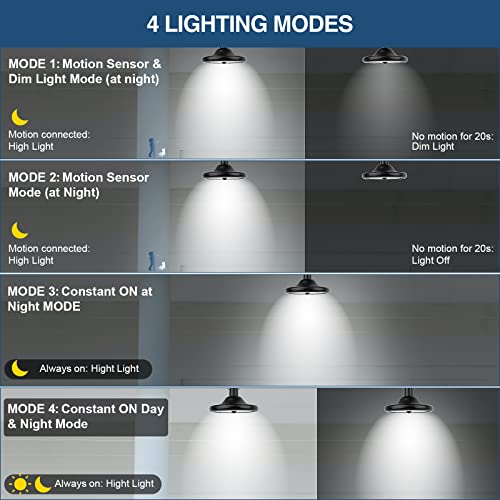 【4 Modalità di Illuminazione】① Modalità 1: quando rileva un movimento, la luce passa a una luminosità elevata, rimane per 20 secondi e poi si spegne. ② Modalità 2: quando rileva un movimento al buio o di notte, la luce passa a una luminosità elevata, rimane per 20 secondi e poi si spegne. ③ Modalità 3: sempre accesa durante la notte. ④ Modalità 4: costantemente accesa sia di giorno che di notte. Controllo a distanza.