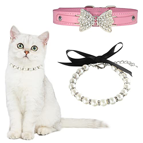 HACRAHO Collana per cani, 2 pezzi, collare regolabile in pelle per cani e gatti, con perle di gatto, con strass, per matrimonio, per cani, gatti, cuccioli, rosa e bianco