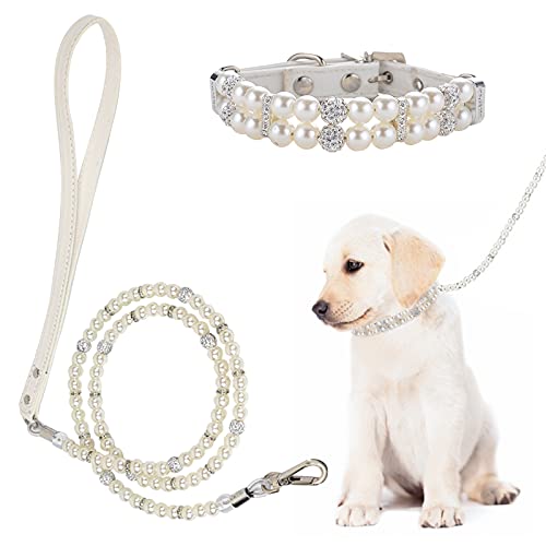 HACRAHO - Guinzaglio e collare per cani e gatti, 2 pezzi, regolabile, in pelle, con perle e strass, per cani e gatti