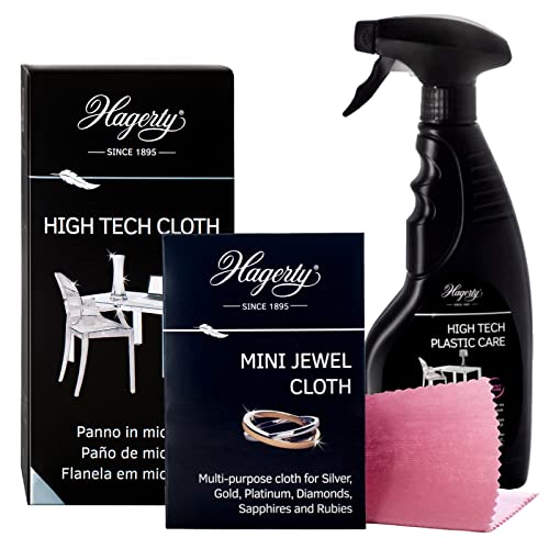 Il kit contiene: Hagerty Crystal Clean Spray da 500ml + Hagerty High Tech Cloth Panno in Microfibra soffice per Dispositivi Multimediali e Superfici Delicate + Mini Jewel Cloth Panno Pulente per Piccoli Gioielli