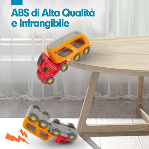 【10 veicoli colorati dei cartoni animati】 Questo set di camion per macchinine include un camion da trasporto più grande e 9 piccoli veicoli colorati. I bambini possono spingere in avanti o indietro per far avanzare il camion.