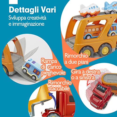 【Giocare e imparare】 Questo set di camion da trasporto consentirà ai bambini di diventare un piccolo guidatore, il grande camion può aprire il paraurti, trasportando una piccola auto a destinazione. Anche la testa del grande trasportatore può girare.