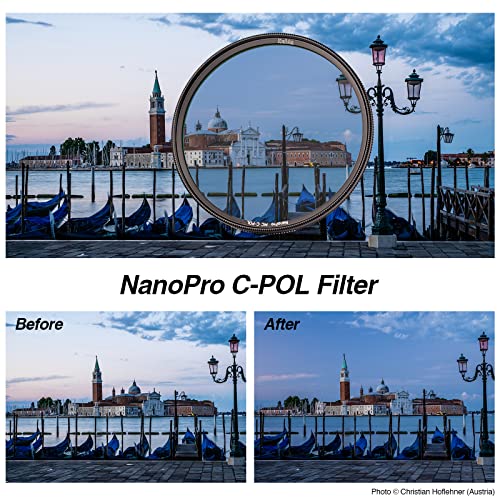 Vetro ottico: questo filtro polarizzatore è costruito in vetro ottico per la chiarezza e la fedeltà del colore e dispone di un anello filtro in lega di alluminio che può essere ruotato per regolare l'intensità dell'effetto di polarizzazione. Il filtro nano rivestimento fornisce uno strato aggiuntivo che si traduce in un migliore effetto di perline quando la superficie viene a contatto con acqua o olio, consentendo una pulizia più efficiente.
