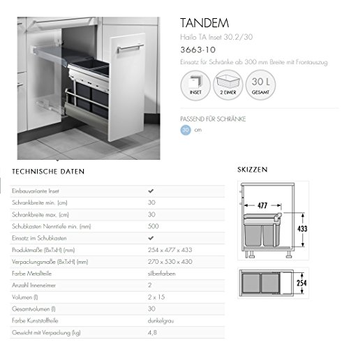 Hailo 3663101 Pattumiera Ta Inset 30.2/30 per mobili a Partire da 300 mm di Larghezza con Parte Anteriore Estraibile