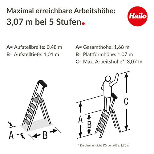 Hailo XXL, Scala Domestica in Alluminio, 5 gradini XXL, EasyClix, Vassoio di stoccaggio, capacità di carico Fino a 150 kg, Prodotto in Germania, 8040-507