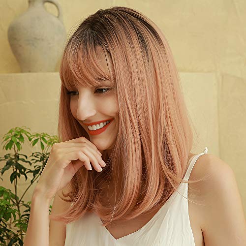 HAIRCUBE Parrucca rosa diritta di media lunghezza con frangia Parrucca da donna sfumata dal nero al rosa Parrucca naturale per la festa quotidiana