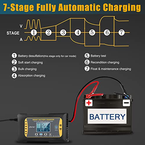 【Ricarica intelligente】 Ricarica completamente automatica in 7 fasi, tra cui desolforazione, avvio graduale, ricarica rapida, ricarica di mantenimento, ecc. La funzione di riparazione a impulsi può riparare batterie vecchie e inattive. (Non si applica alle batterie gravemente danneggiate)