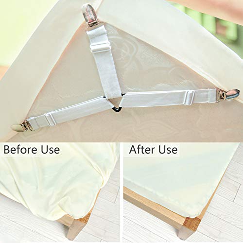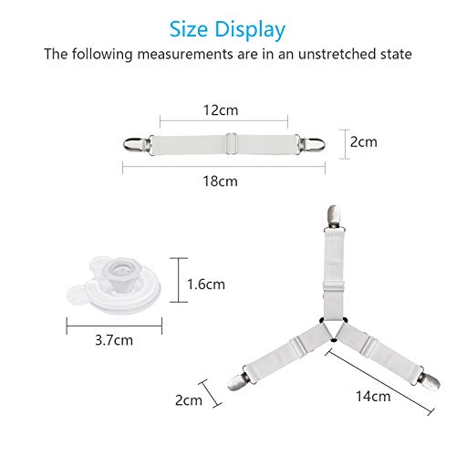 HAKOTOM 8 Pezzi Supporti per Lenzuola Coprimaterasso Cinghie di Fissaggio Elastici Clip con 4 Pezzi Clip per Trapunta Cuscino per Divano Coprimaterasso Bretelle Angolari Pinze (Bianco)