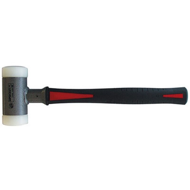 Robusto fulcro centrale in acciaio con inserti intercambiabili in nylon di grande qualità resistente all'usura. Antirimbalzo grazie alle sferette in acciaio all'interno del corpo. Manico tricomponente infrangibile e antiscivolo con anima in fibra di vetro. Uso: Per la spianatura o l'applicazione di pezzi sui banchi macchina e per colpi morbidi nei lavori di montaggio. Ricambi: Per il tassello di ricambio in nylon vedi n. art. 754910. Dati tecnici Antirimbalzo sì Impugnatura Esecuzione ergonomica Tipo di prodotto Martello Materiale manico Manico in fibra di vetro Serie SUPERCRAFT® Lunghezza complessiva, mm 375 Materiale inserto Nylon bianco, duro ⌀ Testa della mazza, mm 50 Lunghezza testa con tasselli, mm 120 Denominazione originale prodotto SUPERCRAFT Peso, kg 1,04