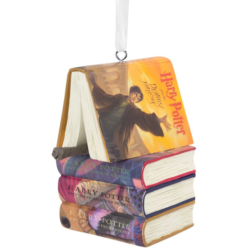 Rivivi l'emozione di aprire un libro di Harry Potter per la prima volta, con questo ornamento in resina con quattro dei romanzi epici impilati con una bacchetta magica. Misura 4 cm per 7 cm, questa statuetta viene fornita completa di un gancio di spago d'argento per scopi di visualizzazione. Il regalo di Natale da collezione perfetto per i fan di Harry Potter.