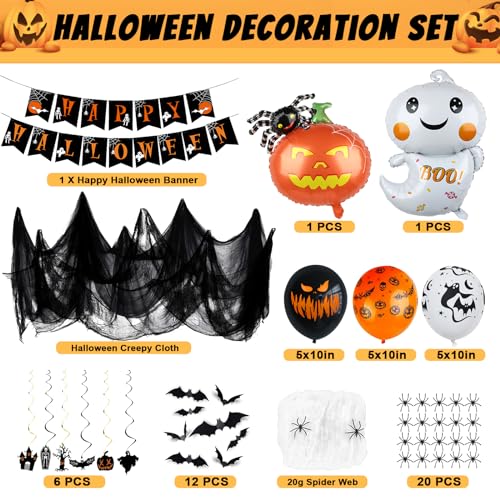 1 panno spaventoso di Halloween, 20 mini ragni di plastica, 40 g di ragnatela e 12 adesivi murali a forma di pipistrello 3D, adatti per decorazioni di Halloween in interni ed esterni per creare la perfetta atmosfera di Halloween.