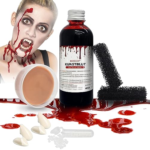 Halloween Sangue Finto Liquido 120 ml e Cera per Trucco 50 g e Denti vampiro Set, Sangue Artificiale Lavabile Abbina con Cera Modellabile e spugnette per il trucco per Horror Realistico Zombie Makeup