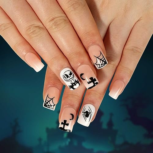 24 Pz Halloween Unghie finte Spider Web Fantasmi Luna Croce Scheletro Artificiale Nail Press su Unghie per le Donne Ragazze (C)