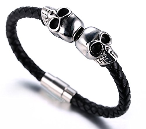 HALUKAKAH ● Assassino ● Bracciale Uomo in Vera Pelle Cuoio con Testa del Cranio in Titanio Acciaio Nero/Argento/Oro 8.46"(21.5cm) con Pacco Regalo Gratuita