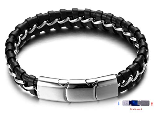 HALUKAKAH Bambini ● Solo Junior ● Bracciale Ragazzo Maschio Vera Pelle Cuoio Nero 6-12+3 Anni Catena Titanio Acciaio Argento Chiusura Magnetica Taglia Regolabile 18-19.5cm con Pacco Regalo Gratuita