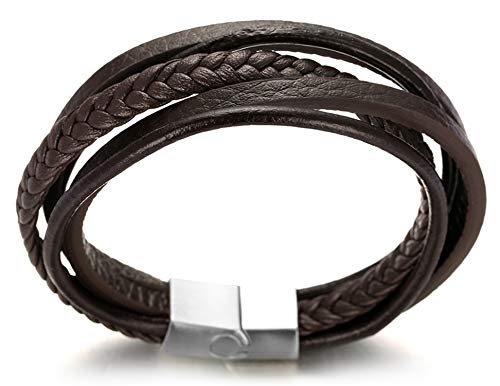 HALUKAKAH Basics ● Viaggio Stradale ● Bracciale Uomo in Vera Pelle Cuoio Marrone Multistrato Chiusura Magnetica in Titanio Acciaio Argento 8"(20.5cm) con Pacco Regalo Gratuita