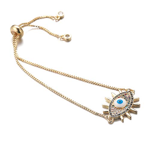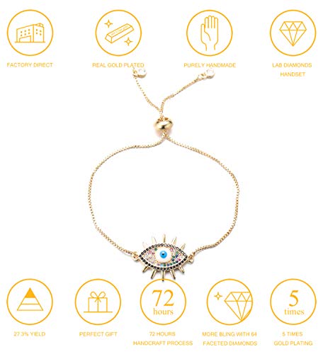 HALUKAKAH Malocchio Bracciale per Donna,Placcato in Oro Giallo Reale 24 Carati Multicolore Occhio Azzurro con Catena a Scatola di Diamanti Iced out Protezione Mal de Ojo Gioielli