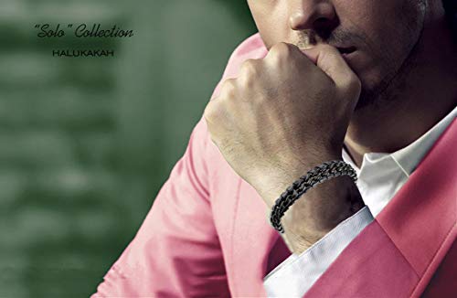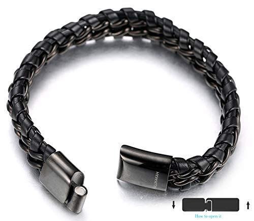 HALUKAKAH ● Onore ● Bracciale Uomo in Vera Pelle Cuoio Doppia Catena in Titanio Acciaio Nero Chiusura Magnetica 8.46"(21.5cm) con Pacco Regalo Gratuita