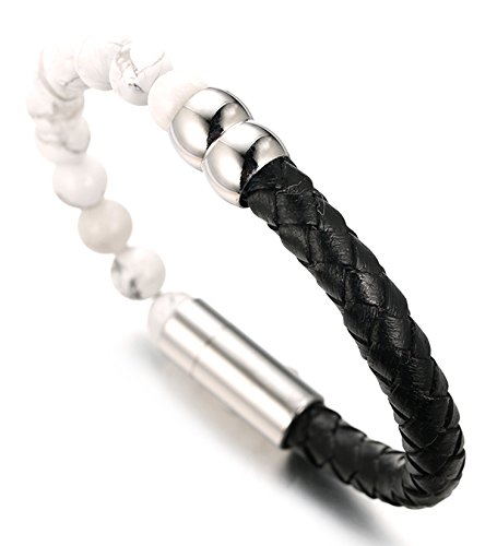 HALUKAKAH ● Saluto Il Terra ● Bracciale Uomo in Vera Pelle Cuoio con Perline in Turchese Bianco, Intelligente Chiusura Magnetica, 8.46"(21.5cm) con Pacco Regalo Gratuita