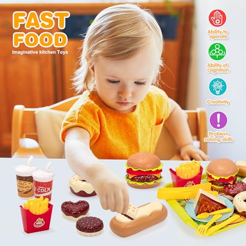 Set Hamburger Cibo Giocattolo Bambini, Giocattoli Alimentari Finti Accessori Cucina con Hamburger Donuts Vassoio, Fast Food Educativo Giochi di Ruolo Regalo per Ragazze e Ragazzi 3 4 5 Anni