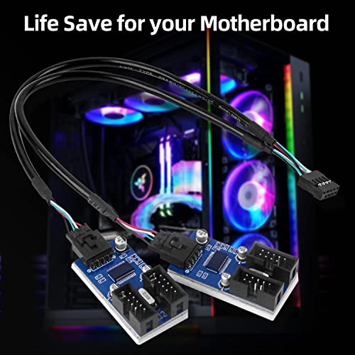 [Sicuro e affidabile] Hub di intestazione USB 2.0 con schermatura della cintura metallica, in grado di prevenire il design della presa di cortocircuito. Lo splitter USB della scheda madre può prevenire la rimozione accidentale del circuito stampato, dei pin e della custodia, il rischio di cortocircuito. Ha anche una luce bianca per verificare che sia acceso e funzionante.