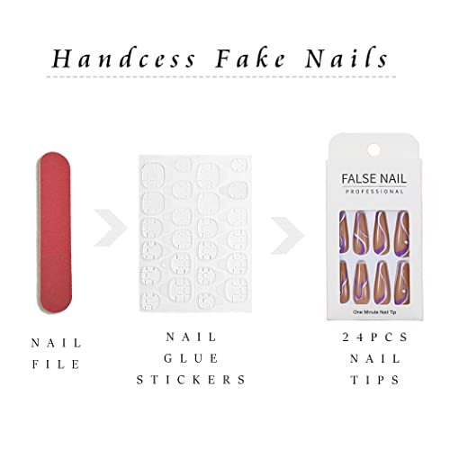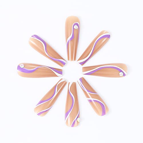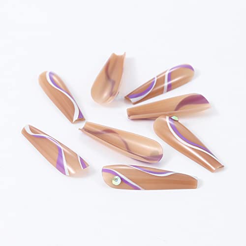 Handcess Coffin - Unghie finte lucide a forma di ballerina lunga su unghie bianche e viola Streamline acriliche finte in cristallo marrone per donne e ragazze (24 pezzi)