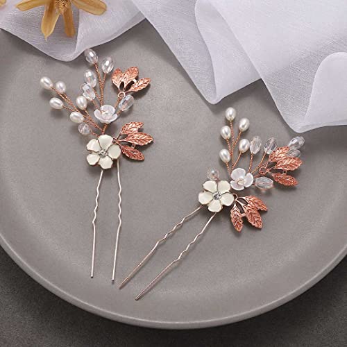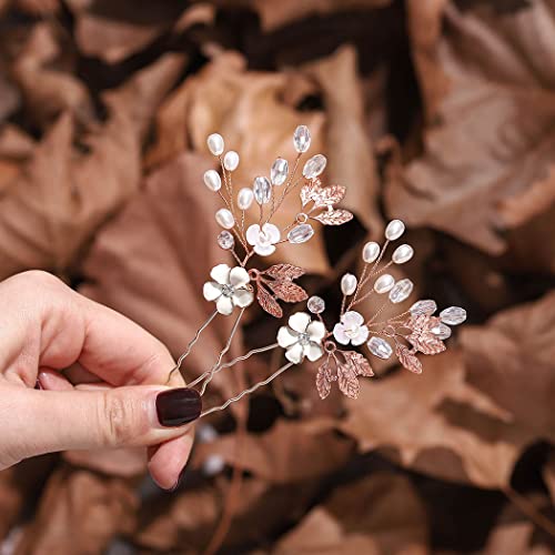 Handcess Fermagli per capelli da sposa, in oro rosa, con cristalli di perle, con strass, accessori per capelli da sposa e damigelle (2 pezzi)
