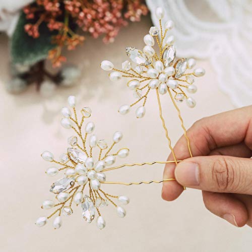 Handcess - Fermagli da sposa con strass e perle, motivo floreale, accessorio per capelli da sposa da donna e ragazza (conf. da 2, colore: oro)